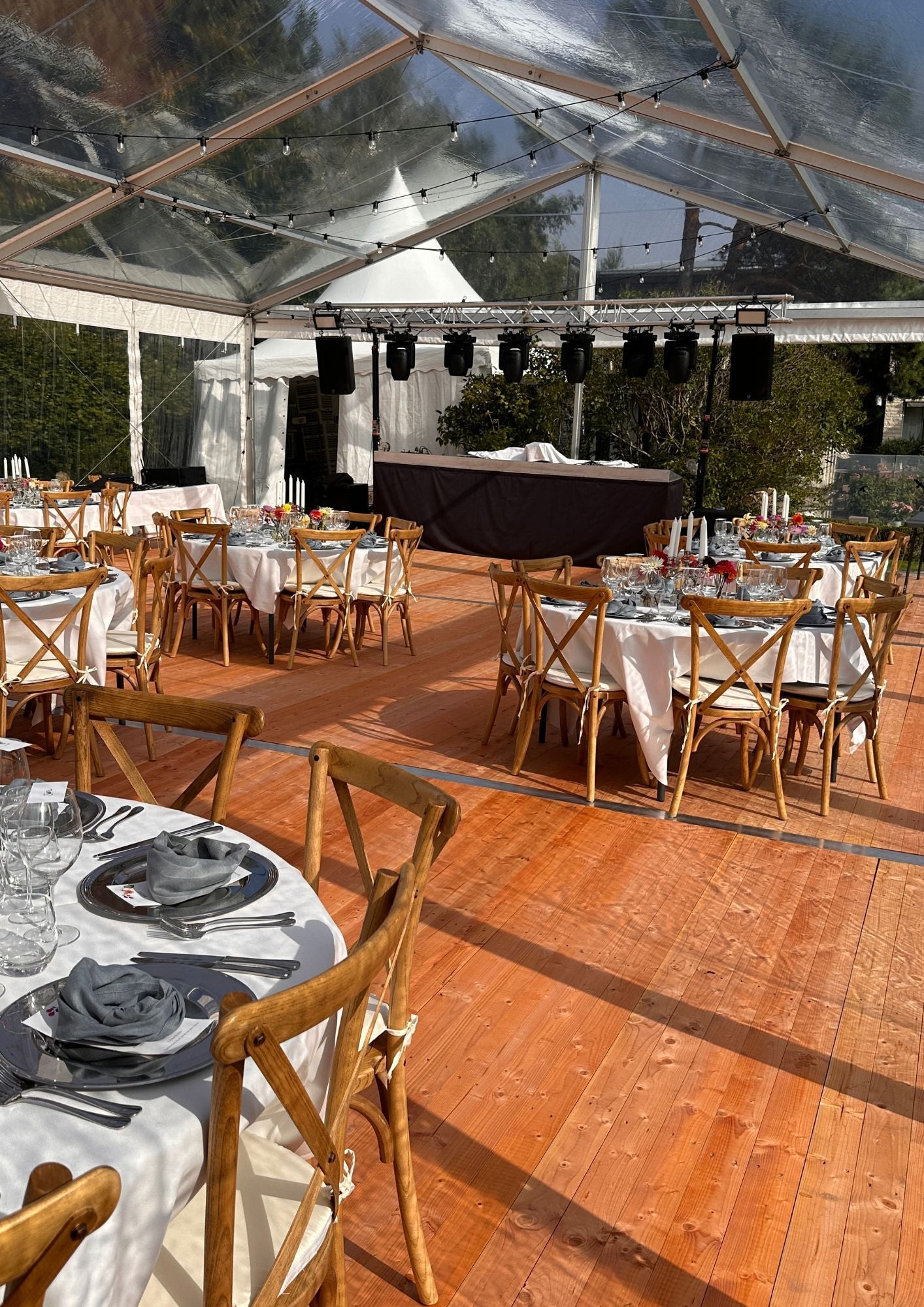 Till detta bröllop för 100 gäster byggde vi ett 10x15 meterstält med transparenta takdukar, placerat precis intill havet för att fånga den magiska utsikten. Intill placerades ett 6x6 meterstält som fungerade som dansgolv. Båda tälten hade golv och vi levererade dessutom möbler, porslin, ljud, kylskåp och dekor – en komplett lösning för en oförglömlig kväll.