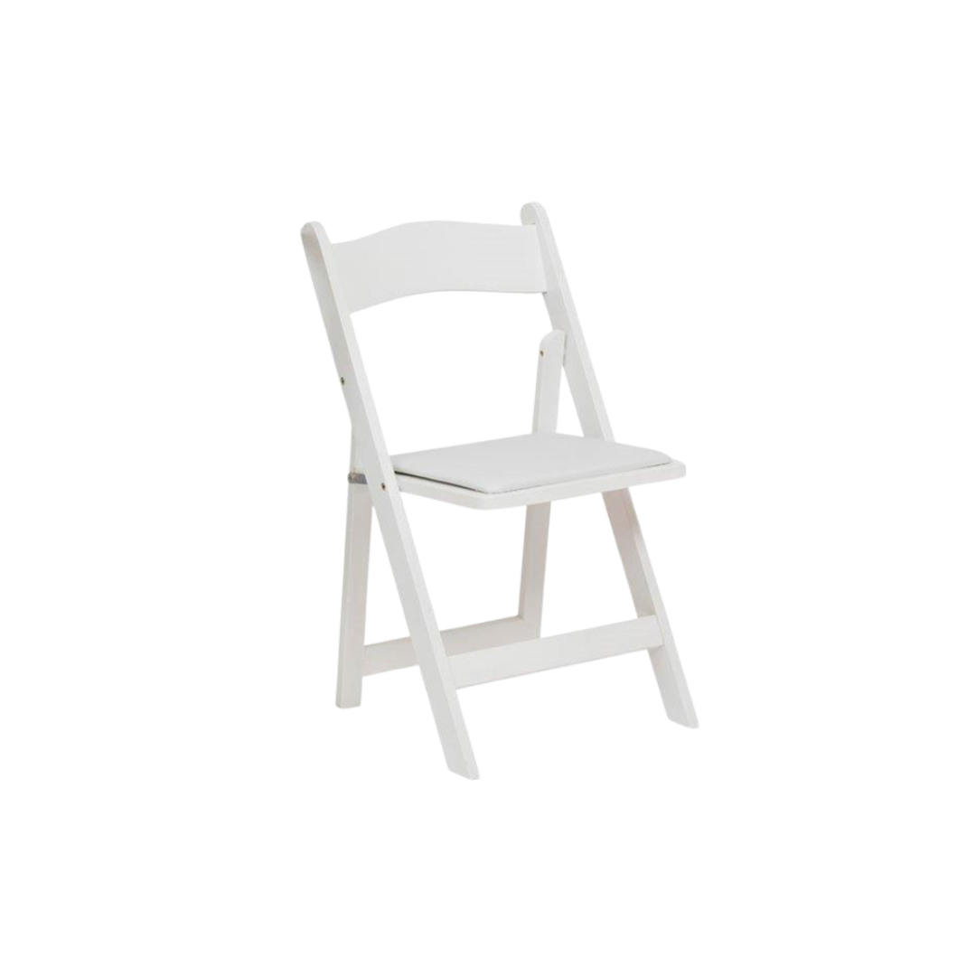 Vit klappstol med bekväm dyna – elegant och funktionell för bröllop, företagsevent eller andra tillställningar där stil och komfort räknas. Stolen är lätt att hantera, enkel att ställa undan och gör sig lika bra utomhus som inomhus.
