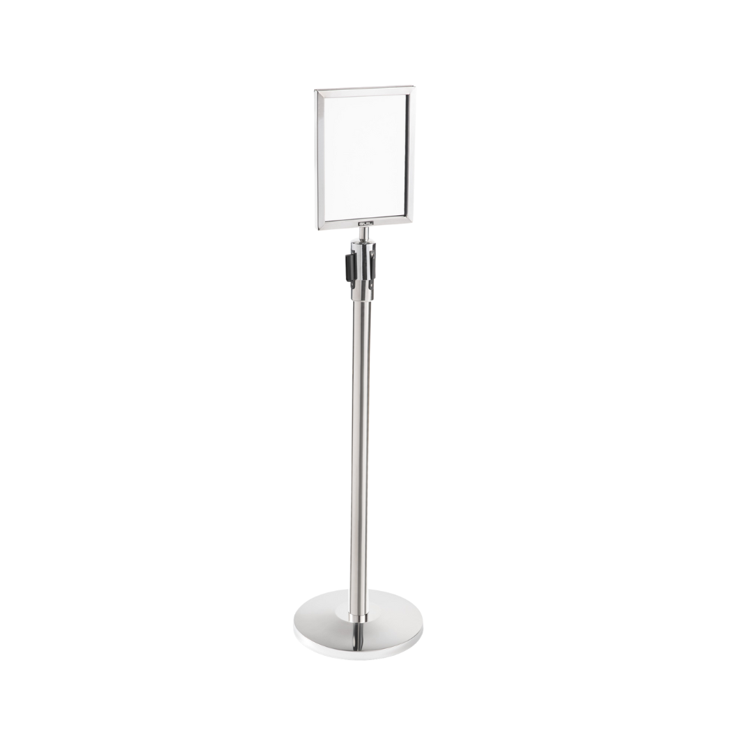 Skylthållare till avdelningsstolpe – Silver är ett stilrent och praktiskt tillbehör som används för att visa information, vägvisning eller budskap vid entréer, köer, eventytor eller utställningar. Monteras direkt på våra avspärrningsstolpar och håller A4-skyltar i stående eller liggande format. En perfekt lösning för professionell och tydlig kommunikation i miljöer med publikflöde.