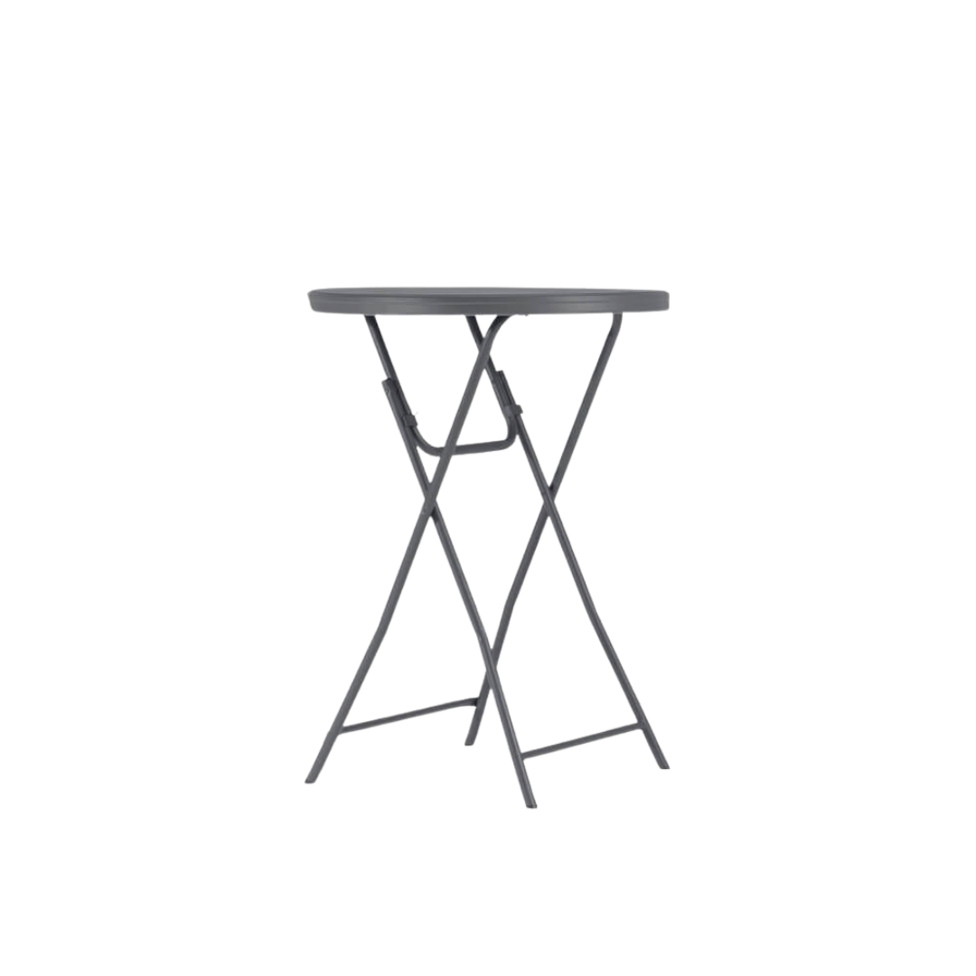 Ståbord i stilren Shark Grey-nyans, perfekt för mingel, buffé eller event. Robust plastskiva och stabil metallram med infällbara ben – enkelt att transportera och hantera. Passar både inomhus och utomhus.